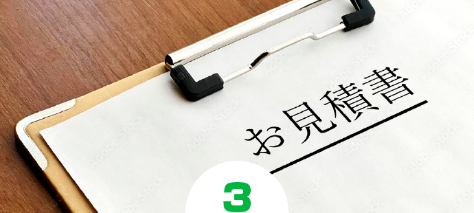 ご依頼の内容に応じて、無料でお見積りいたします。現地でのお見積り、お写真からお見積りも可能です。お見積金額に納得されない場合はキャンセルも可能ですので、お気軽にご依頼ください。お見積りにご納得いただけた場合、日程の調整を行わせていただきます。